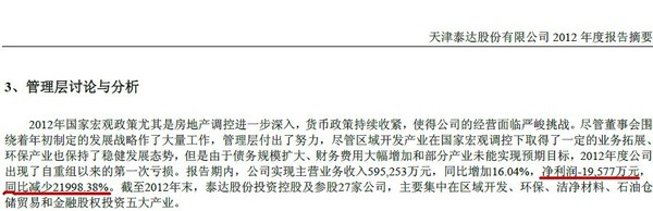 业绩变脸在市场本不是什么稀罕事,可泰达股份在2012年的变脸幅度之大,却让人始料未及,大跌眼镜。