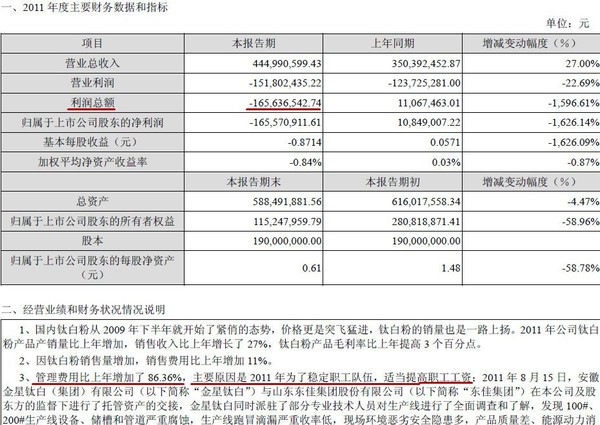 *ST钛白公司2011年业绩快报显示,2011年公司钛白粉产品产销量比上年增加,销售收入比上年增长了27%,钛白粉产品毛利率比上年提高3个百分点。销量增加,利润增加,*ST钛白为何业绩还要下降?对此,公司表示,“为了稳定职工队伍,适当提高职工工资”,从而造成了管理费用比上年增加了86.36%。2月18日公布业绩快报的成霖股份,表示公司去年的净利润为亏损1.08亿元,而“最低工资上调”成为公司给出的首要原因。