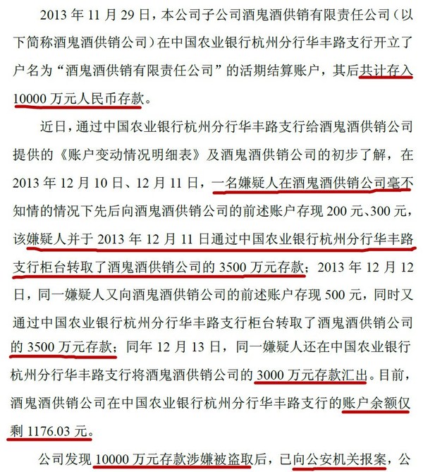 上市酒企酒鬼酒今年1月20日公告1亿元存款资金被盗,拖累2013年业绩预亏近7千万元。