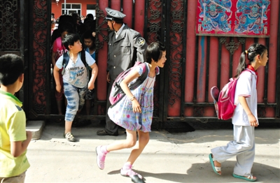 昨日,奶西村,被打少年小刚就读的学校加强了安保。与以往放学时大门敞开不同,学校只开放一扇小门,学生排队走出校门。新京报记者 王叔坤 摄