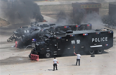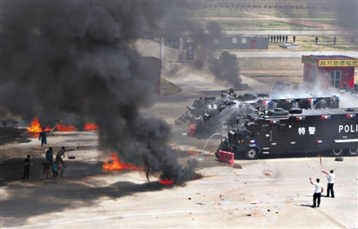 昨日,多警种联合处置“非法聚集滋事人员”现场,警方出动水炮车、防爆车进行处置。当日,北京市组织大规模反暴恐演习,2800余名专业反恐防暴人员参与。