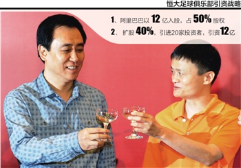 根据马云和许家印达成的战略协议:广州恒大足球俱乐增资扩股,阿里巴巴以12亿元人民币入股恒大足球俱乐部,与恒大分别拥有增资扩股后俱乐部的50%的股权。