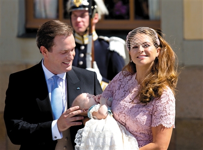 2014年6月8日,瑞典斯德哥尔摩皇后岛,玛德琳公主和丈夫抱着女儿莱奥诺小公主在教堂接受洗礼。