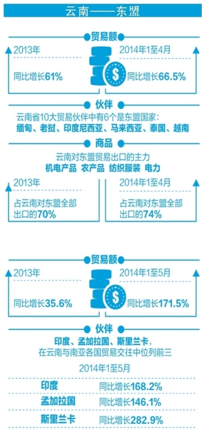 随着大通道的加快建设和口岸设施的不断完善,2013年,云南省货物贸易进出口总额同比增长22.9%,高于全国15.3个百分点,增速为沿边省区第一。