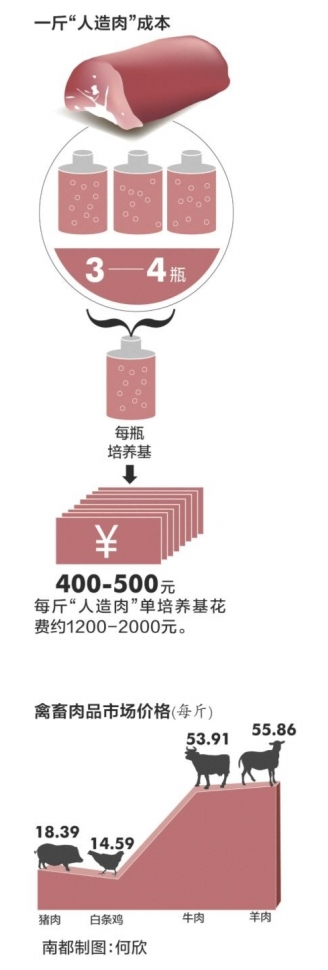 而对于3D打印禽肉,其价格更是昂贵。“培养一块肉,即使仅是让它形成好的口感,至少需要一周的时间。”虽然比饲养禽畜的时间要短,但3D打印技术运用于打印畜肉,在徐铭恩看来,最大的门槛在于成本贵。“要培养出一斤肉,光培养基至少要三四支,每支培养基价格要四五百元。另外体细胞在体外培养还需要血清,血清的成本也相当贵。”