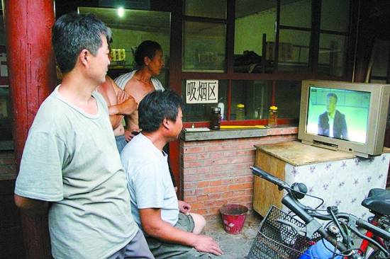 西城区新街口房管所的建筑工人在看世界杯新闻。范雪摄