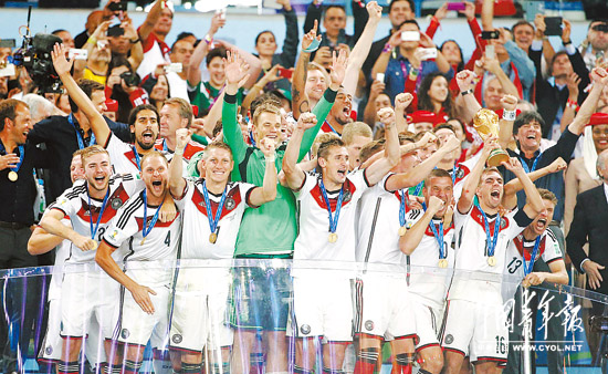 当地时间7月13日,德国队队员在颁奖仪式上高举大力神杯欢庆夺冠。特派记者 刘占坤摄