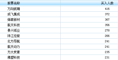 大赛高手7月以来买入最多的个股是万向钱潮,成飞集成和烯碳新材分列二三位。同为航空航天概念的航天科技和航天动力分列第四和第八位,买入人数分别为356人和241人,加上共有372人买入的成飞集成,这三股的合计买入人数接近1000人。
