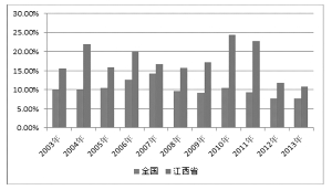 江西省和全国GDP增长率对比,如下图所示: