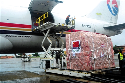 11日,几内亚,来自中国的抗击埃博拉救援物资抵达机场。