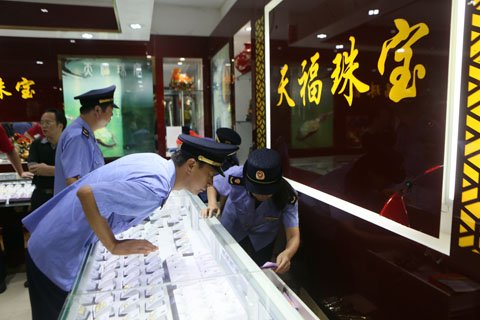 相关部门对“天福珠宝”店铺进行检查,未发现店铺柜台有彩券。新京报记者 周岗峰 摄
