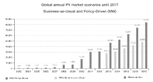 EPIA在《Global Market Outlook For Photovoltaics 2013-2017》中,对2013-2017年全球光伏市场年新增安装量进行了预测,具体情况如下图: