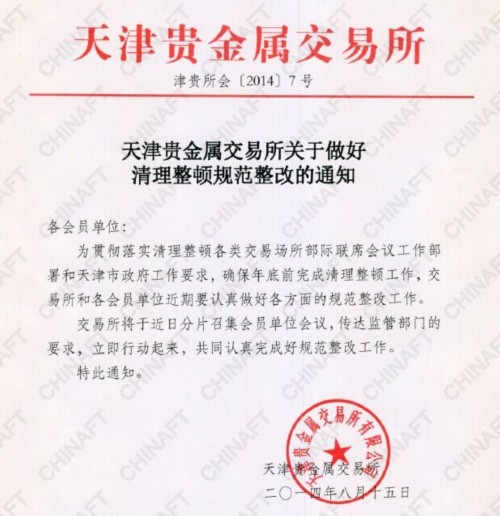 昨天,一份“天津贵金属交易所关于做好清理整顿规范整改的通知”在网上流传,落款时间为8月15日。