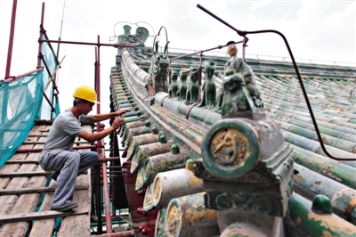 昨日,记者来到天坛公园宰牲亭,这里正在进行修缮,大殿外架着脚手架,上面铺着木板,大殿已经油饰一新。几名工人正在进行擦拭门窗,还有的工人站在脚手架的二层,拿笔在房檐下描画。