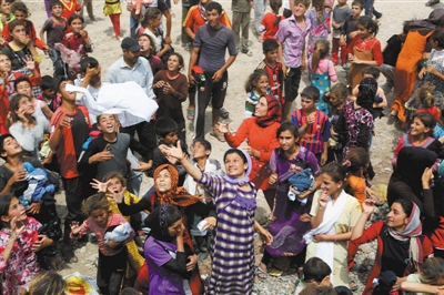 日前,伊拉克Feeshkhabour镇的难民营外,慈善机构向逃离家园的人们空投衣物。