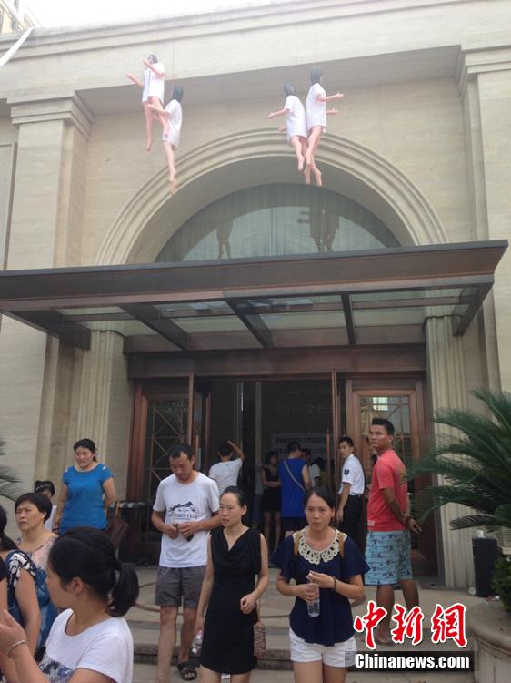 浙江金华一楼盘打折销售 业主拉横幅挂充气娃娃抗议
