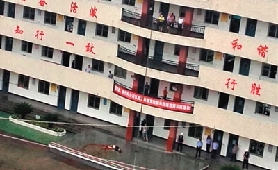 被推出教室后,陈严富坐在五楼的栏杆上,脚踩在走廊一个闲置的桌子上,“还把水果刀拿在手里来回晃,眼光向教室两侧来回扫。”陈长海称,他立即报了警。对峙了近10分钟后,校外传来警笛声,陈严富将手里的水果刀扔到了楼下旗台上。随后,警察进入校园,陈严富纵身跳了下去。