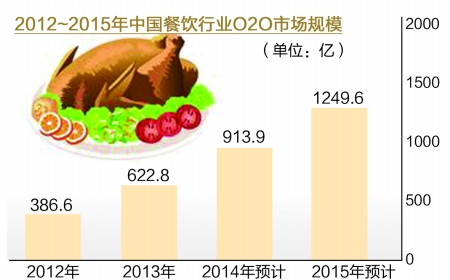 外卖O2O是继团购后,被巨头看好的又一垂直电商领域。据品途咨询2013年发布的数据显示,预计2014年中国餐饮行业O2O市场将达913亿元,2015年将突破1200亿元。