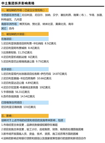 二、中土集团非洲事业二部全体人员及业务;非洲事业一部负责南部非洲的人员及业务;援外部全部人员及业务;轨道事业部人员,项目及现使用的主要设备、办公场所,划入中非公司。