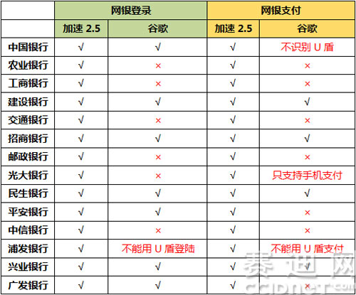 笔者随后测试了两个浏览器分别登陆交通银行、农业银行等的网页,结果显示,像所有chrome内核的浏览器不支持网银功能那样,谷歌chrome35浏览器无法支持用户正常使用各大银行网站,而2345加速浏览器2.5版升级为双核浏览器后,登陆网银页面会自动应用IE内核,能够支持用户方便登陆网银页面,但暂不支持手动切换内核。