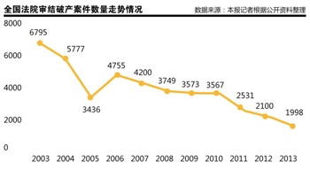 报告显示,2003年,全国法院共审结了6795起破产案件,到2012年,这一数字递减为2100件。2014年3月,最高法院院长周强在全国“两会”上作工作报告时,公布的数字又下降为1998件。