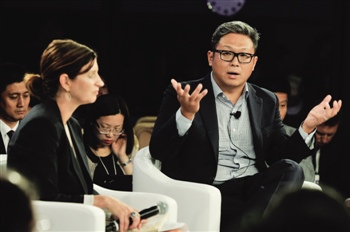 在分论坛“技术展望:再次遭遇互联网泡沫?”上,光速安振中国创业投资基金联合创始人兼董事总经理曹大容(右)发言。