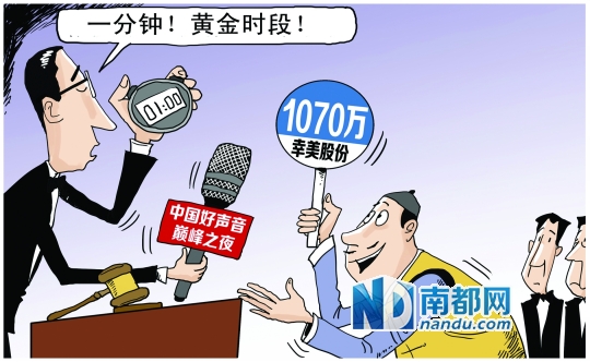 经济表情 广东日化企业幸美股份以1070万元标下中国电视史上最贵单条广告———《中国好声音》巅峰之夜一分钟的连播黄金广告。