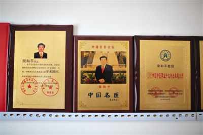 常和平挂在诊所内的各种“名医”、“大师”头衔。