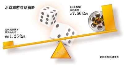 今年4月,北京旅游旗下摩天轮公司参与投资的电影《同桌的你》获得4.65亿元的票房,摩天轮在该片的投资金额2000万元。摩天轮还与一家韩国公司合拍了《我的野蛮女友2》,这部电影将于2015年情人节上映。