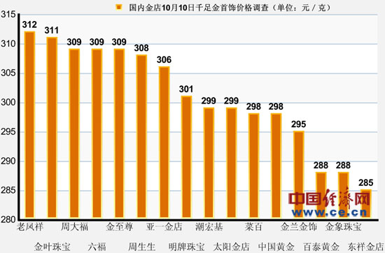 中国经济网记者本次统计的金店中有4家香港珠宝企业,周大福千足金首饰309元/克;周生生千足金首饰308元/克;六福珠宝千足金首饰309元/克;金至尊千足金首饰309元/克。