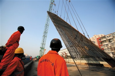 昨日,地铁8号线3期大红门站施工工地,工人们开始安装42米的防渗槽。新京报记者 侯少卿 摄