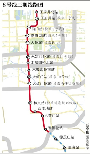 由于穿越王府井、前门、珠市口等繁华商业区的地铁干线,8号线三期施工难度大、风险高,将采取先南后北分段开通运营的模式。乐观估计,8号线南段瀛海站至珠市口站将在2016年开通,而北段前门站至王府井北站与8号线二期美术馆站的衔接贯通尚无明确时间表,最快有望在2017年开通。