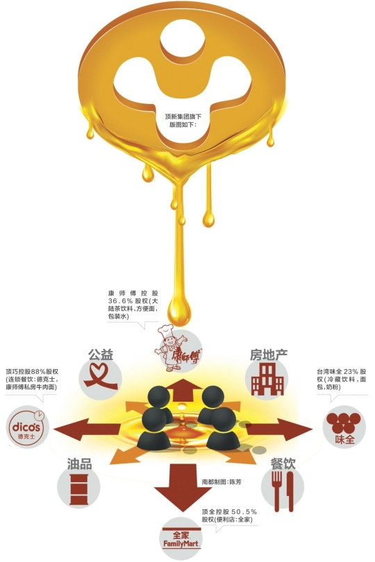 目前顶新的业务除了食品以外,还有便利店、餐饮、地产以及电信,在中国的员工数目达到十万人,这个庞大的商业帝国去年总体营业额为新台币2 .5兆(约合人民币5000亿)。即使在台湾,其油品业务的收入其实只占到顶新集团总的收入的很小一部分。不过,油品是顶新台湾业务的起点,顶新的前身来自于魏和德(魏家四兄弟的父亲)在1958年于台湾彰化创办的“鼎新制油工厂”,更于1974年更名为“顶新制油公司”。