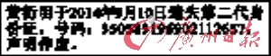 本人所有的位于本市荔湾区西华路418号2200铺(属测量D2207图13幅53地号)的房地产权证(2008版)(权证号码:650028891号)已遗失。对此声明有异议者,请在30天内书面向广州市荔湾区房地产登记交易所(地址:荔湾区浣花路浣南街5号)提出,并提供相关证明材料,特此声明。声明人:陈洁仪2014年10月21日