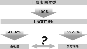 在上海文广集团的整合计划中,吸收合并东方传媒和广电发展是重要一环。其中东方传媒直接控股百视通41.92%股份,收购完成后上海文广集团将直接持有百视通41.92%股份。广电发展直接持有东方明珠45.20%股份,东方传媒持有东方明珠0.035%股份,收购完成后,上海文广集团将直接控股55.32%。