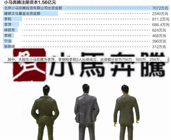 根据小马奔腾的工商注册资料显示,公司注册资本1.56亿元,金燕为法定代表人。大股东为北京小马欢腾投资有限公司,出资金额7072万元;第二位是建银文化基金,出资金额2340万元;而李莉、李萍、钟丽芳、李明、宁浩、张晓陵分别以自然人股东的身份排在第3~8位,出资金额分别为811.2万元、686.4万元、624万元和468万元、390万元、312万元。