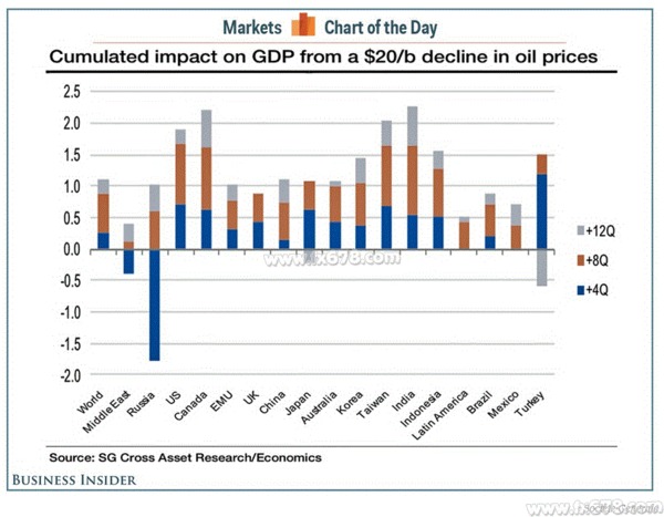 摘要:近几周来,原油价格一直在持续下跌。对于原油输出国来说,油价下跌会对其GDP增长产生直接的负面冲击,同时也会对石油进口国的GDP增长产生强烈的撞击,尤其对美国、加拿大以及一些亚洲国家。法国兴业银行发布研究报告称,在第一年的冲击过后,油价每桶下跌20美元将会为全球GDP作出0.26个百分点的贡献。【实时策略】