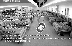 在有关医药行业投资论坛上,血液透析服务也是今年的一个热门话题,上市公司中,新华医疗、常山股份等公司今年年中开始介入血液透析市场。今年6月,新华医疗董事长赵毅新对外称,新华医疗准备于今年建立10家血液透析中心,明年建20家,2016年再建30家,计划到2020年,公司血液透析产品线整体营收规模在10亿元以上。