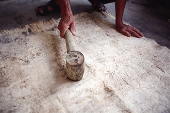 这样的敲打可能要断断续续地持续一个多月,直至整张树皮的质地发生了巨大的改变——坚硬的树皮变得柔软许多,原本粗糙的树皮表层竟然出现了触感很好的絮状物。