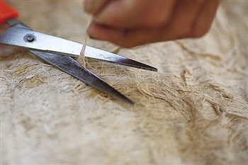 王文奇还会在敲打的过程中,不断地用剪刀剪去树皮表面参差不齐的、翘起的纤维,就像修剪去一块面料表面多出来的线头。这样,树皮逐渐朝着布的方向演变,最后它真的变成了一种独特的面料。