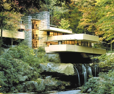 流水别墅是赖特为卡夫曼家族设计的别墅,在瀑布之上,悬空的楼板锚固在后面的自然山石中。