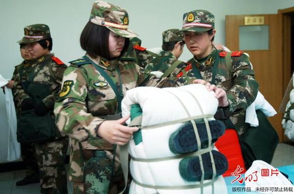 2014年12月9日早上至下午,武警北京总队二支队四中队37名新兵正在全程参与该部组织的3000余名新兵野外20公里徒步拉练。图为整理背包。