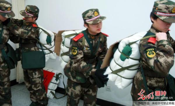 2014年12月9日早上至下午,武警北京总队二支队四中队37名新兵正在全程参与该部组织的3000余名新兵野外20公里徒步拉练。图为整理背包。