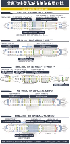 美联航(UA)在三舱布局的宽体客机上,针对国际长航线和北美地区航线,此前已分别有不同的头等舱/商务舱细分产品提供。但是,在国际长航线上美联航环球头等舱 (Global First)和商务头等舱(BusinessFirst) 是什么关系?达美的飞凡商务舱虽名为商务舱但竟比头等舱更高一等?在享受产品细分带来的好处的同时,还是有不少人会被这些五花八门的名头搞得一头雾水。以北京飞往美东城市为例,借助TripAdvisor旗下手机应用SeatGuru的数据,我们从国航(CA)、海航(HU)、达美(DL)、美联航(UA)、美航(AA)所有这五家提供直飞服务的航空公司中,各选一个主力航班,将其舱位布局以及座位空间大小做一个直观对比(见下图)。此外,达美此番舱位重塑,在延续自家两舱布局基础上,使得产品划分更为清晰,继其常旅客计划新方案(从以飞行里程改为以机票价格计分)之后,是否会再次引发业界跟进效仿,值得关注。(编辑 马红斌)![]()