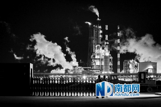 驱车行驶在产业园区,粗大的公共油廊管线在高大的钢铁框架内,蜿蜒着将经由海运至此的原油输入已建成开工的炼化工厂,载有危险运输品的货车来往穿梭,用于化工厂废气排放燃烧的“点天灯”高耸,倒映在工厂旁边暗黑色的水沟里。拉土的大货车不停忙碌着,新的工厂仍在铺垫待建……