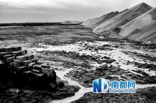 成片的盐田和高高堆起的盐山。这些工业盐和提炼的溴素直接供给附近的化工厂。