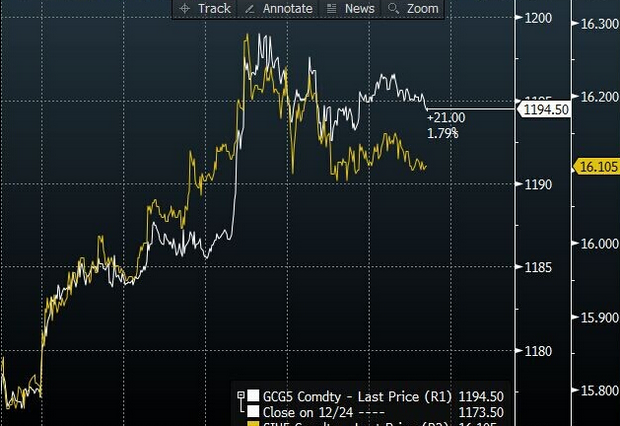下图为美国COMEX 2月黄金期货价格(白色折线)与COMEX 3月白银期货价格走势对比图: