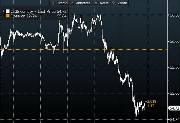 原油价格周五(12月26日)冲高回落,进而落得连续第五周下跌,因为投资者担心,石油输出国组织(OPEC)拒绝减产的行为恐怕会让全球能源供应过剩问题雪上加霜。