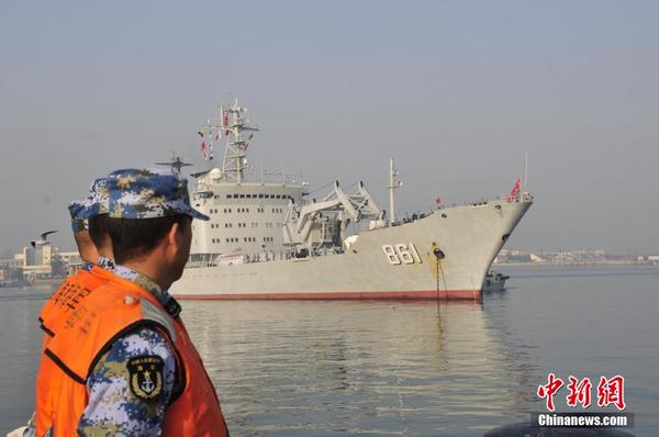 12月30日,长兴岛船载誉归来。当日上午,中国海军长兴岛船圆满完成赴马尔代夫紧急供水任务返航回国,靠泊青岛某军港。北海舰队在码头隆重举行仪式,欢迎长兴岛船载誉归来。12月4日,马尔代夫首都马累市水务公司海水淡化厂发电机组设备故障,致海水淡化装置无法工作,全城断水,市民日常生活受到严重影响。应马尔代夫政府请求,中国紧急调派航经附近海域船只前往供水。5日晚上,海军命令正在印度洋海域执行任务的长兴岛船连夜高速向马累港航渡,准备开展国际人道主义救助行动。据了解,长兴岛船除自身携带部分淡水外,还装备有多套海水淡化装置,每天可生产淡化水70余吨。12月14日,马方海水淡化厂受损设备修复,供水危机解除。在历时10天的紧急供水任务中,该船共为马累市供应淡水700余吨,帮助马累民众顺利渡过难关。中新社发 王光飞 摄![]()