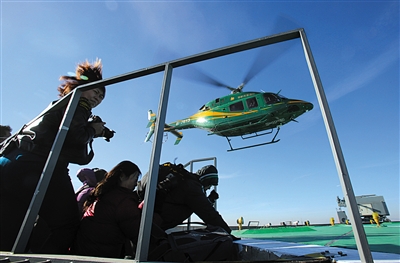 昨日,一架贝尔429型直升机准备降落在国贸三期顶层停机坪。当天,一架120航空医疗救援直升机和一架商务直升机先后降落在中国国际贸易中心国贸大厦(国贸三期)顶层停机坪。这是国贸三期2010年8月投入使用后,顶层停机坪首次起降直升机,标志着这个北京城区内最高直升机停机坪正式启用,同时也将开辟北京第一高楼急救航空通道。新京报记者 李冬 摄影报道